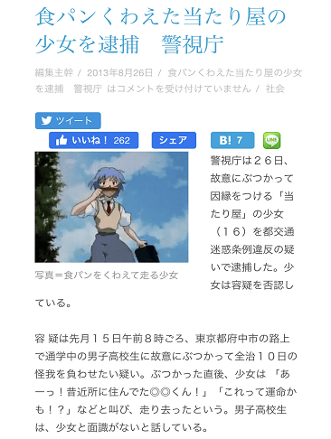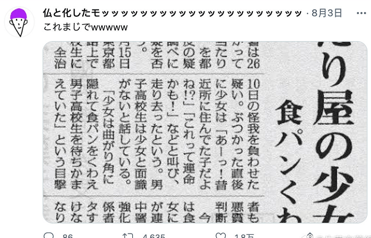 最近在网上看到一个非常多人点赞的假新闻,说是日本东京西府中警察局最近逮捕了一位经常叼着面包在转角处撞人的少女。
