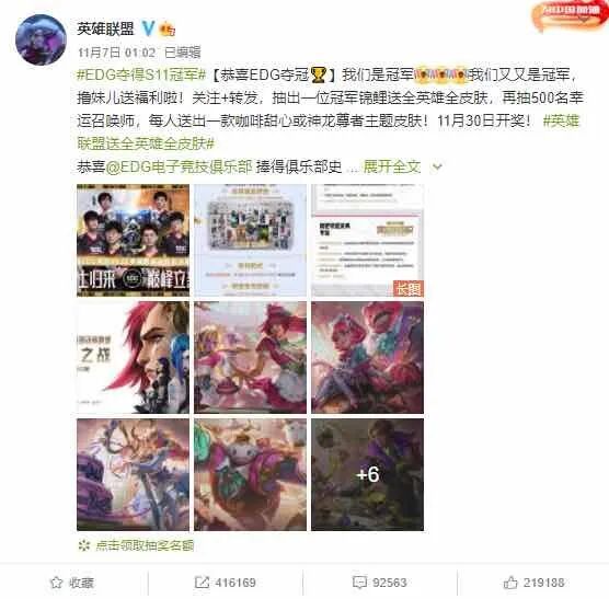 11 月 7 日的朋友圈几乎只有两件事:「下雪了」和「EDG 牛逼」,关注后者也被认为是年轻人的象征。电竞爱好者小王表示,7 日凌晨 EDG 夺冠后,自己的朋友圈在五分钟之内刷出了上百条有关 EDG的动态,「甚至很多不怎么玩游戏的人都在熬夜刷屏,当时的刹那恍惚以为电竞真的已经成为全民赛事了。」这场热闹,源于 EDG 这个「年年 8 强,偶尔 16 强的」的中国队伍终于拿到了 LOL 全球总决赛的冠军。11月 7 日凌晨 1 点 10 分左右,2021 年《英雄联盟》全球总决赛(简称 S11)在冰岛首都雷克雅未克落幕。总决赛中,中国大陆赛区 ( LPL ) 的 EDG 战队与卫冕冠军、韩国 LCK 赛区的 DK 战队打满五局,原本不被看好的 EDG 战队在 1:2 落后的情况下逆风翻盘,以 3:2 的战绩逆转战胜韩国赛区的 DK 战队,获得冠军。这是 EDG 队史首次获得 S 赛冠军,也是 LPL 中国大陆赛区电竞历史上的第三座英雄联盟总冠军。此前的两座是 iG 和 FPX 分别在 2018 和 2019 年夺冠。 这场全球总决赛,是所有英雄联盟赛事中最高荣誉、最高含金量、最高竞技水平、最高知名度的比赛 。在过去的 10 年 S 赛历史中,出现过 3 次中韩决赛对阵的时刻,分别是 2013 年、2014 年、2020 年,前面三次 LPL 赛区均以失败告终,这一次是 LPL 战队第一次在 S 赛决赛舞台击败来自韩国 LCK 的对手。赛后,这场比赛在国内外的社交平台上引起巨大反响,央视新闻微博官方账号也第一时间发文送上祝贺。有关 EDG 相关的内容也开始频繁上热搜,截至 11 月 8 日 7:00,「EDG 夺冠」词条阅读量高达 29.2 亿,据新浪微博统计,EDG 夺冠当天相关的热搜足足有 80 条之多。甚至很多年轻人在决赛前立下了有些「恶俗」的flag:「只要 EDG 拿冠军,我就裸奔」、「只要 EDG 夺冠,我就喝洗澡水」……图 / 微博 燃财经截图一些上了年纪的网友见此情景甚至感叹道,「上次看到这么热闹的场景还是中国足球队打进世界杯。」英雄联盟 S 赛作为中国最火的电竞赛事,一定程度上反应了中国电竞行业的发展势头,从被认为是「不务正业」,到如今全网为之沸腾,中国电竞产业一路走来并不容易。并且,就在 S 赛决赛前两天,在第四届中国国际进口博览会上,杭州亚组委首次公布了杭州亚运会电子竞技小项设置,英雄联盟、王者荣耀 (亚运版)、和平精英 (亚运版)、炉石传说、刀塔 2、梦三国 2、街霸 5 和 FIFA Online 4 等 8 个项目入选。这表示电竞比赛正式成为了「主流选手」。2020 年中国游戏产业年会披露数据,该年中国电子竞技游戏市场实际销售收入 1365.57 亿元,比 2019 年增加 418.3 亿元,同比增长 44.16%;中国电子竞技游戏用户规模达 4.88 亿人,同比增长 9.65%。腾讯电竞发布的《2021 版中国电竞运动行业发展报告》显示,2021 年全球电竞观众规模将达到 4.74 亿,中国有望凭借着 3.6 亿美元的收入成为全球赛事收入最高的电竞市场。尽管如今电竞存在的争议依然很大,但可以预判,EDG 的夺冠不仅只是狂欢一夜,对未来中国电竞相关产业也将有极大助推 谁在看S11?