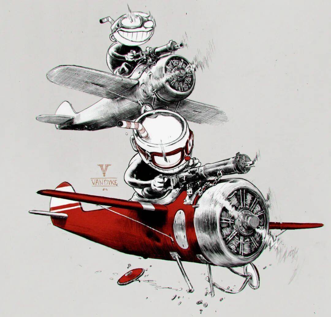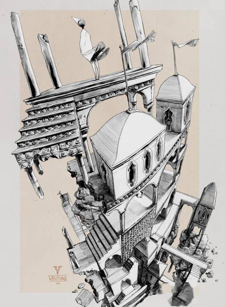 他主要使用铅笔、墨水、水粉进行绘画,最后再用Photoshop进行颜色修饰和细微调整。