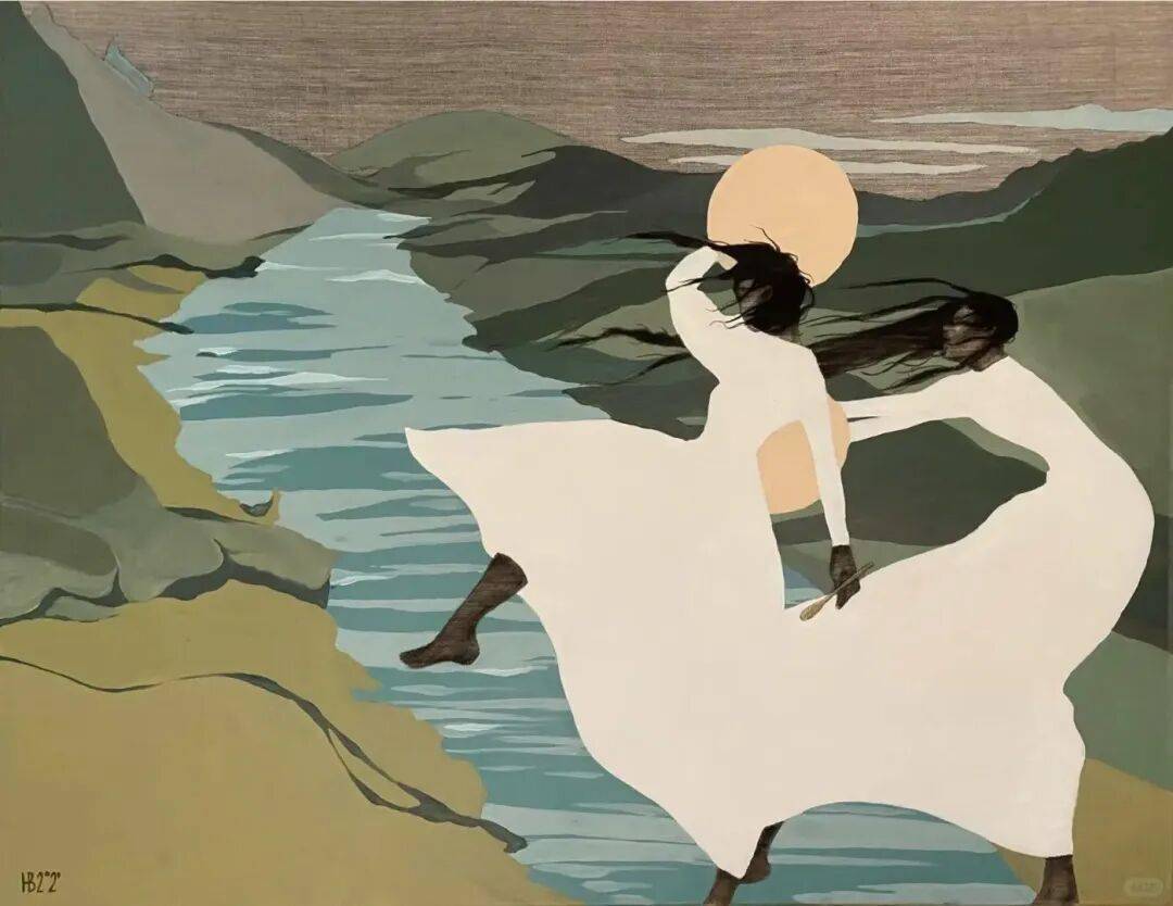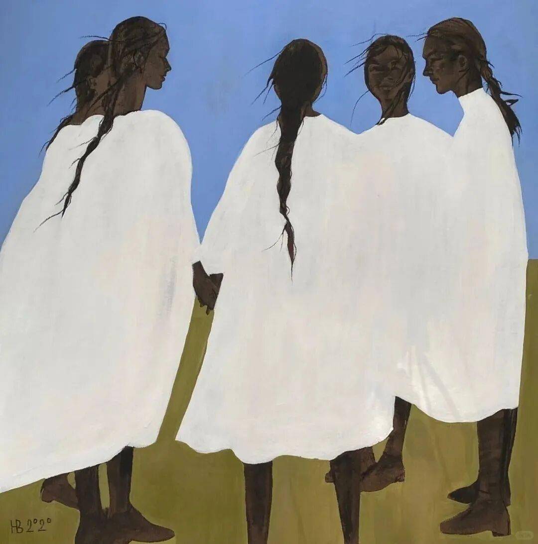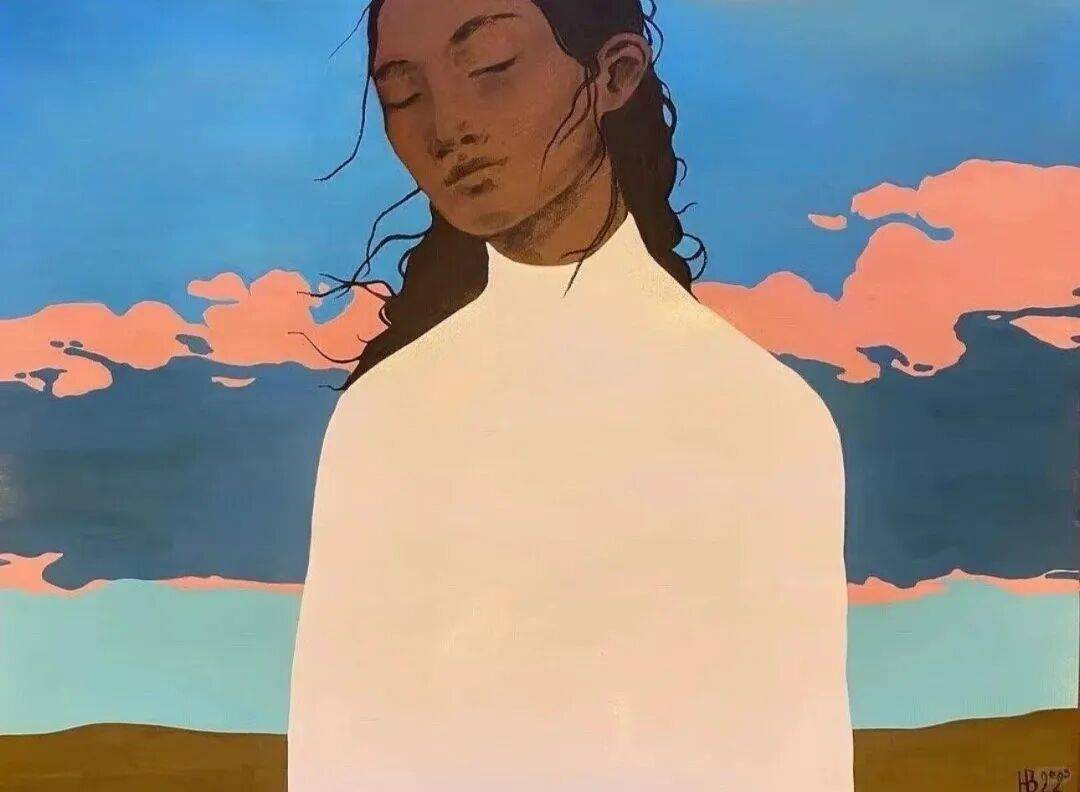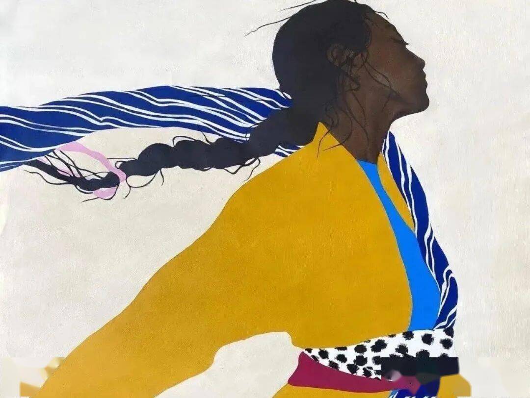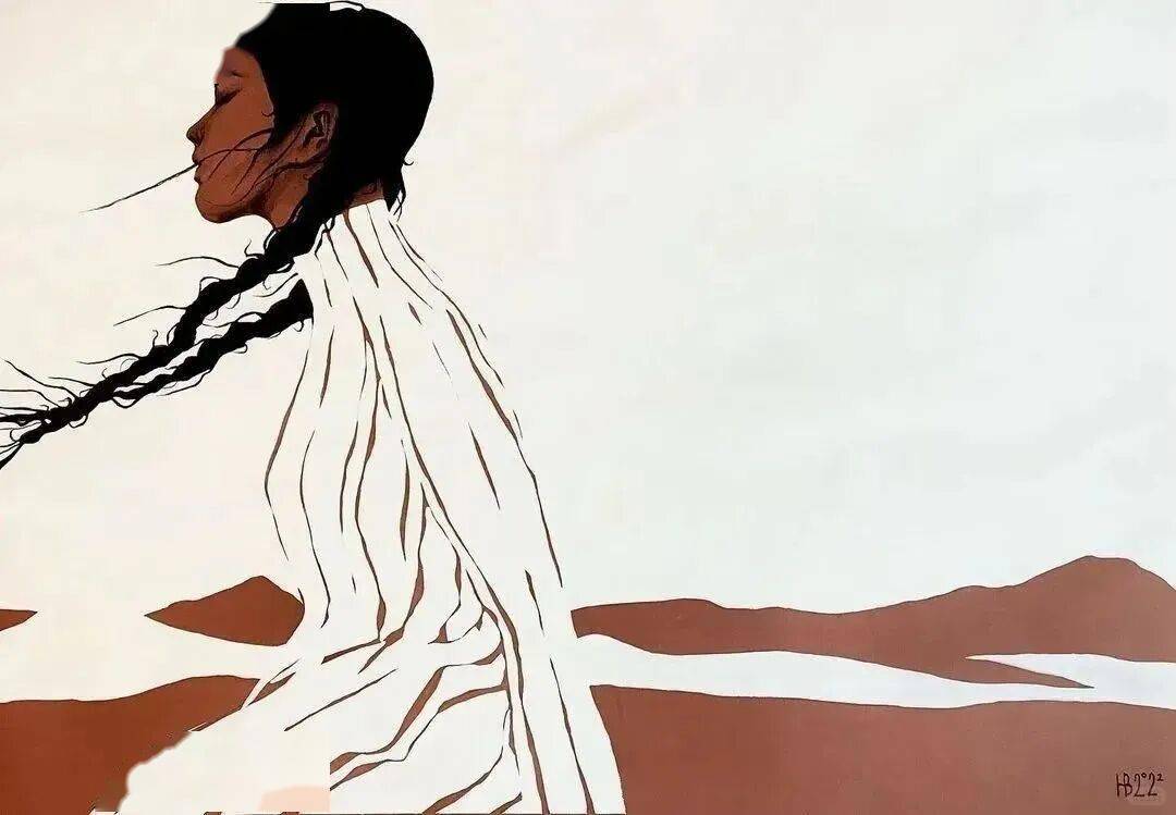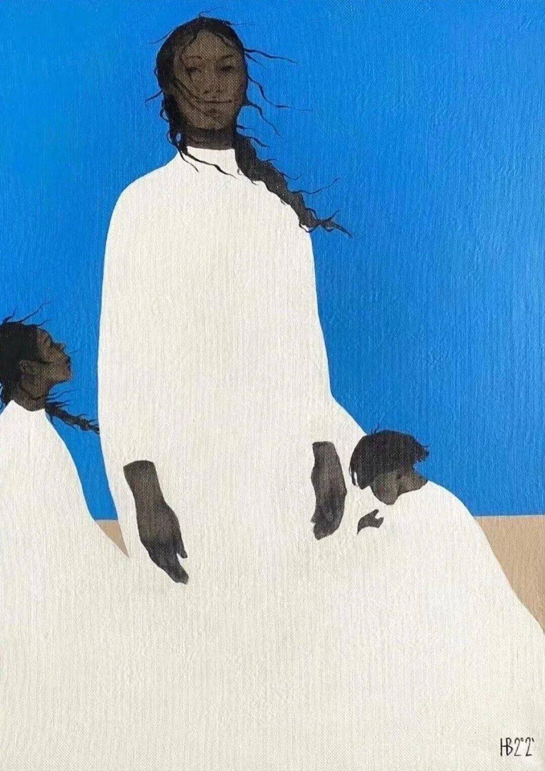 画中的女性,常常是乌黑的肌肤与麻花发辫,有时一身素白,有时身着民族服饰,她们与风共舞,与山海相拥。