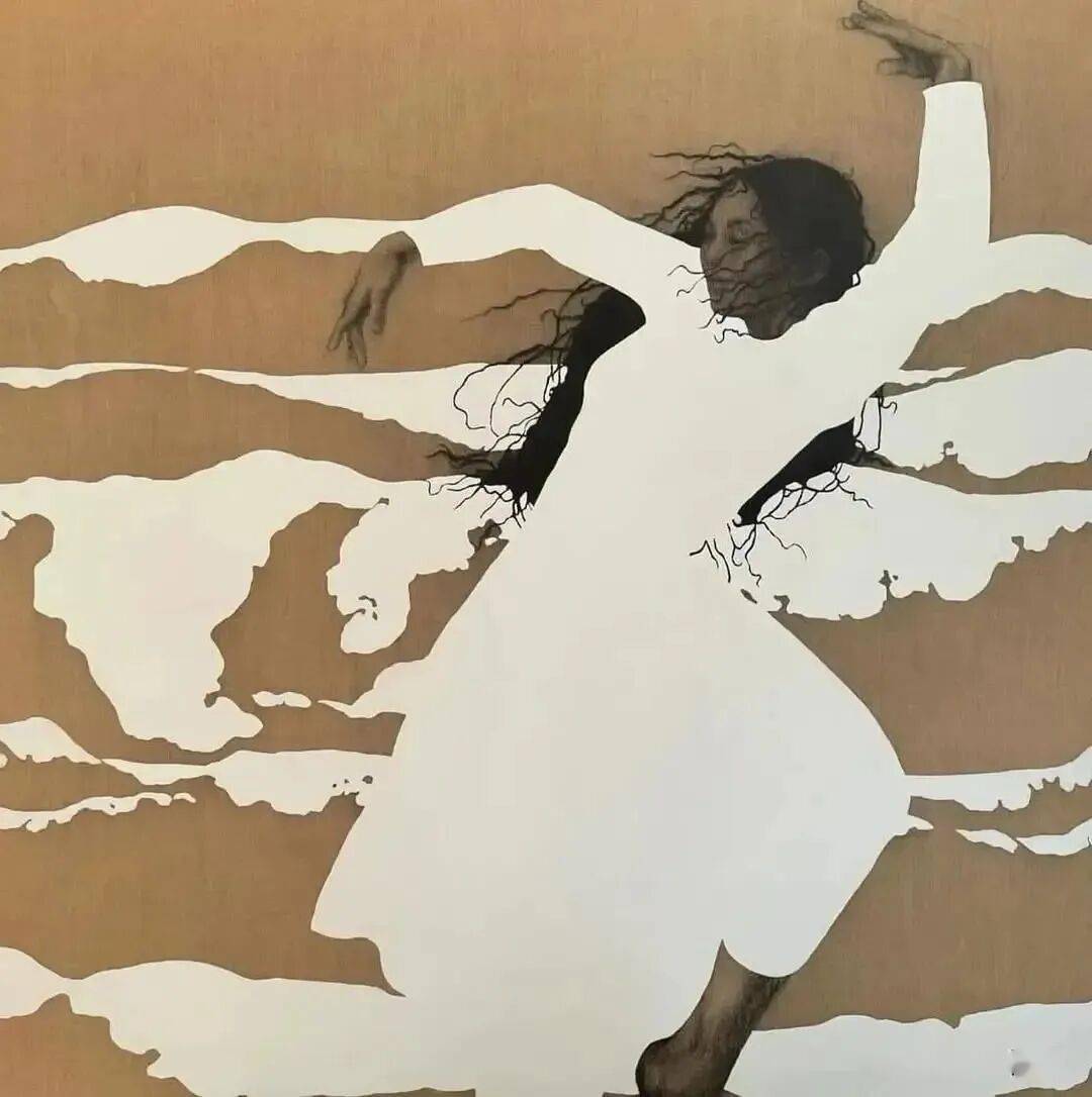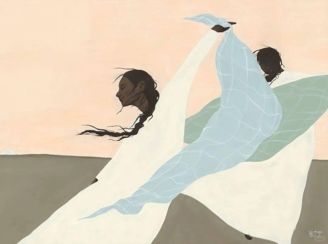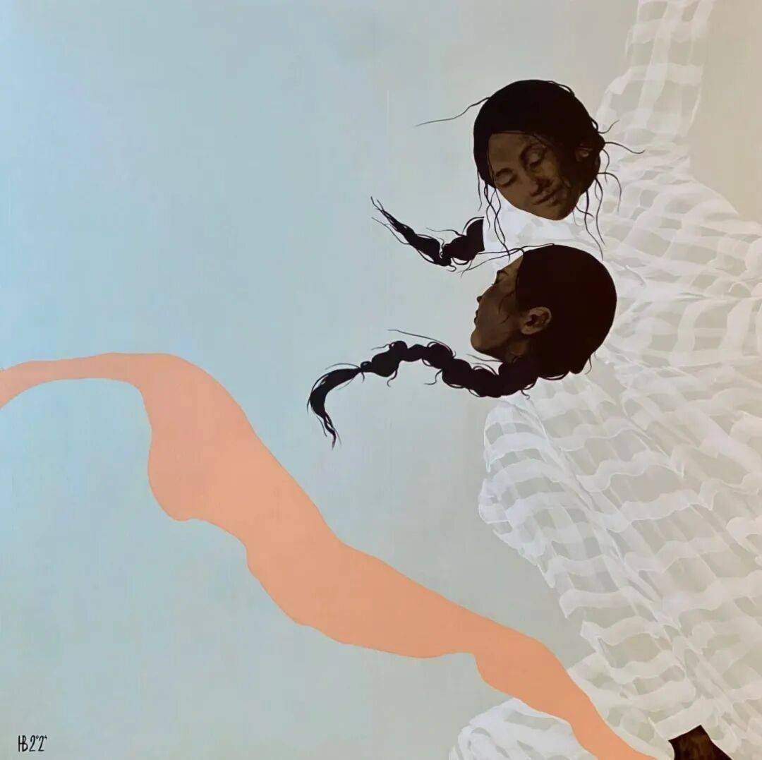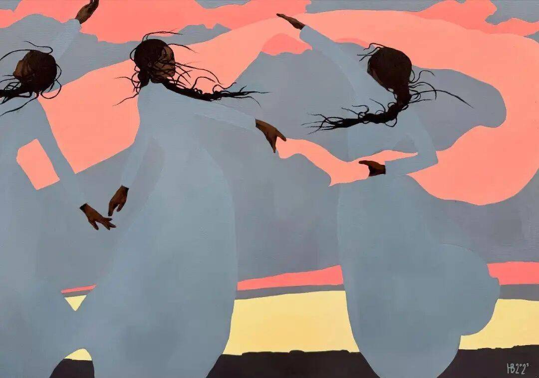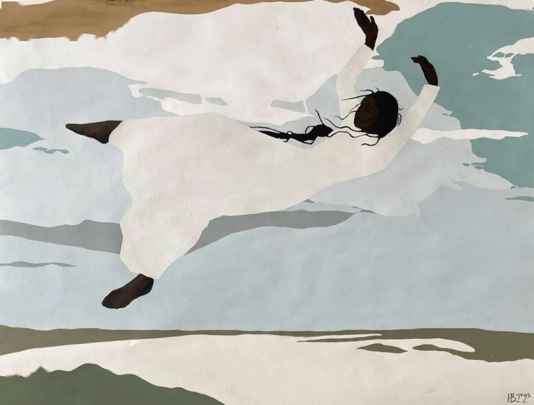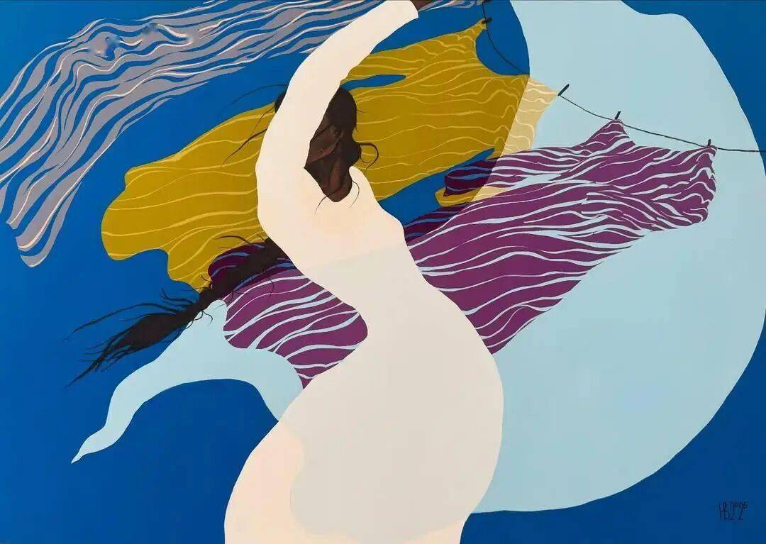 画中的女性,常常是乌黑的肌肤与麻花发辫,有时一身素白,有时身着民族服饰,她们与风共舞,与山海相拥。