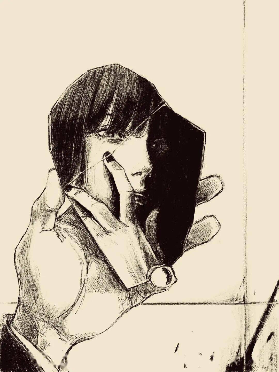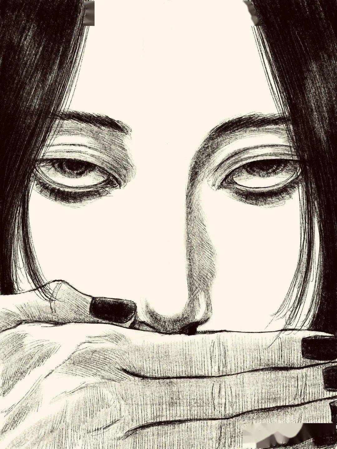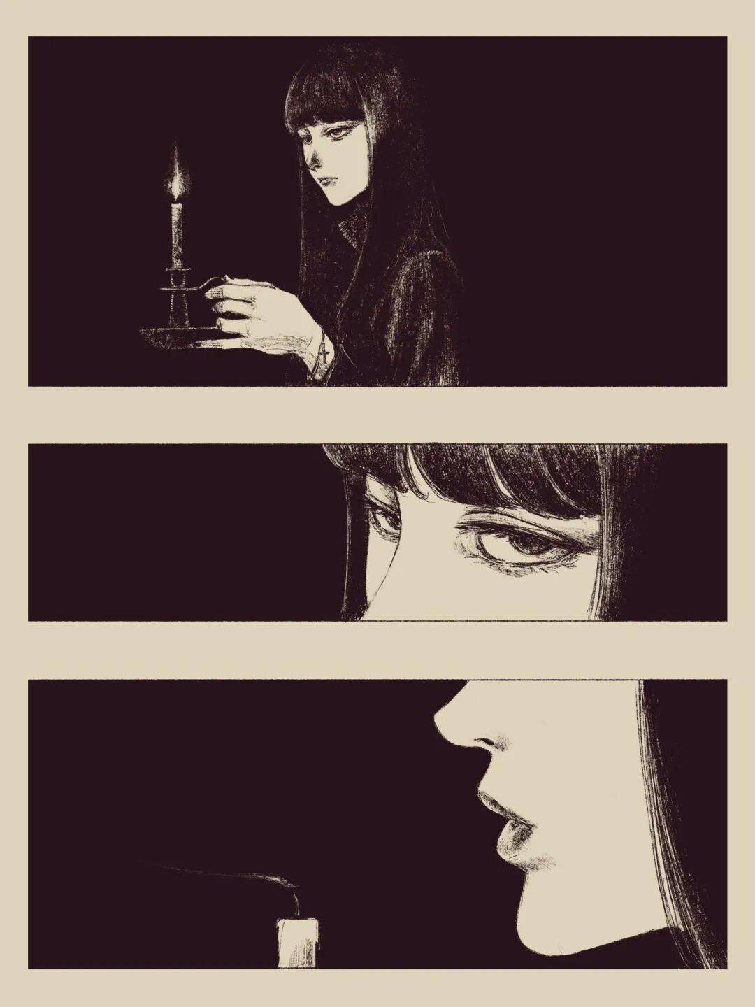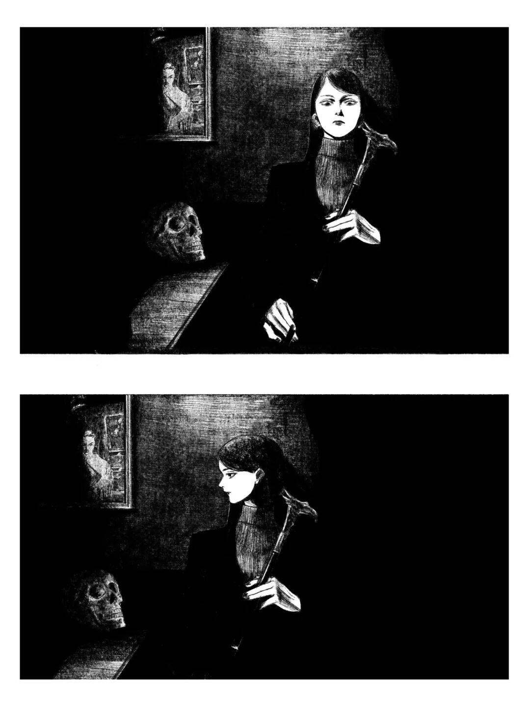 伊藤润二擅长通过十分密集的排线、大面积留黑以及对面部区域的适当变形,积聚起强大的人物张力。